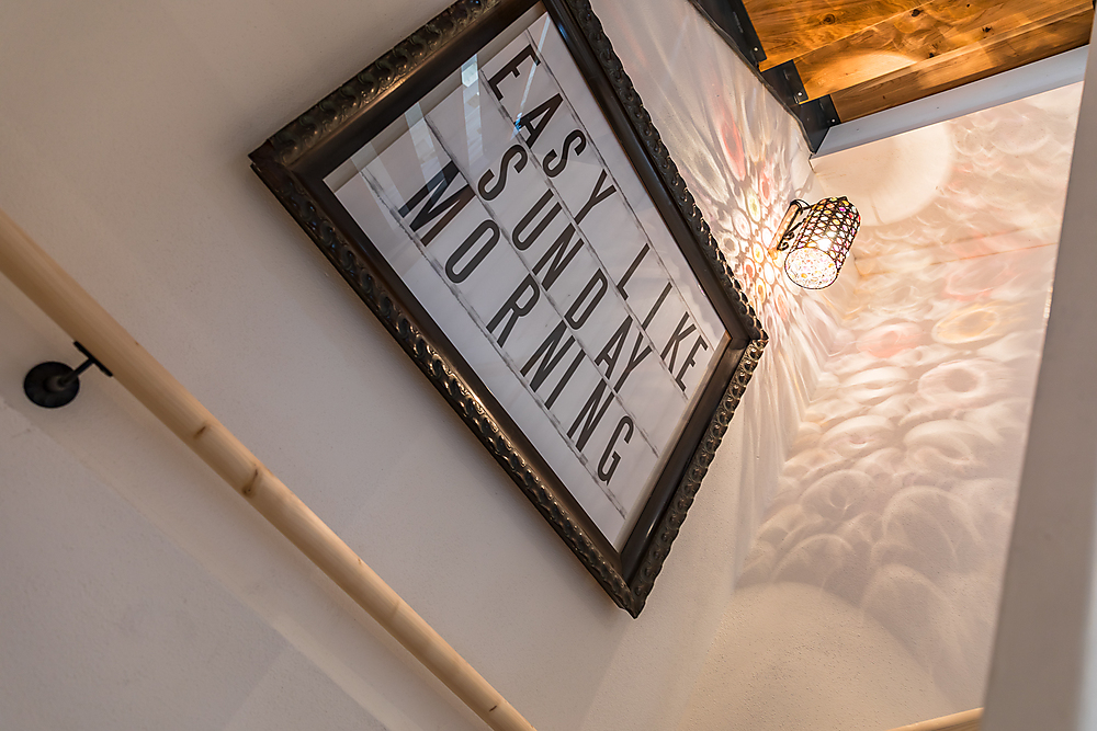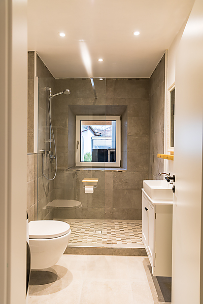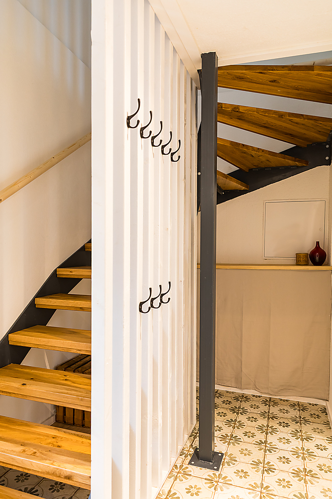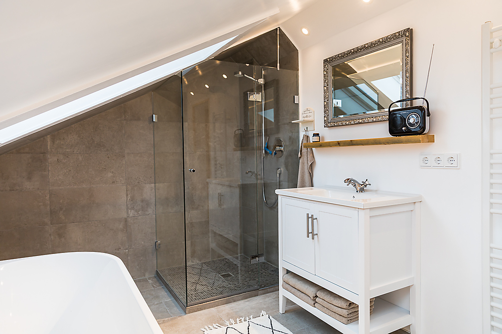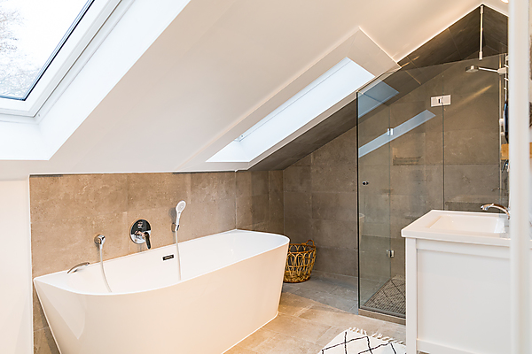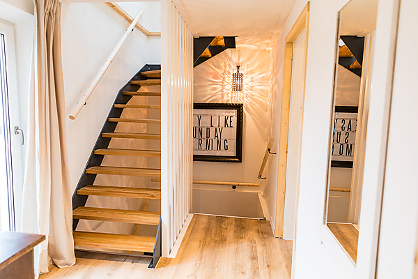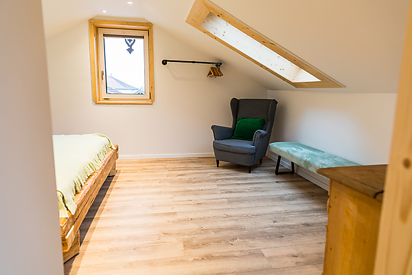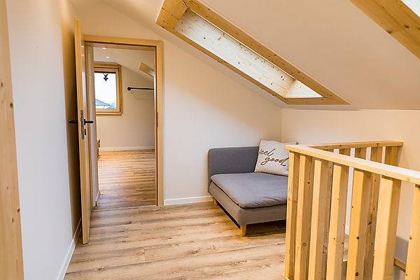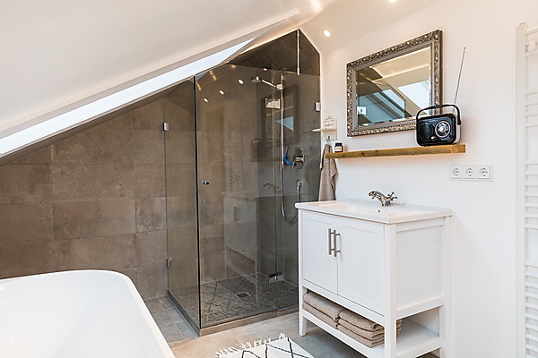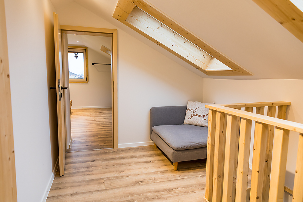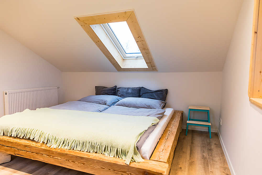 Zweite Etage: Badezimmer mit Badewanne (Blick in den Himmel unter einem Dachfenster), Schlafzimmer mit Doppelbett (2 Meter auf 2 Meter) in der Dachschräge, kleiner Flur