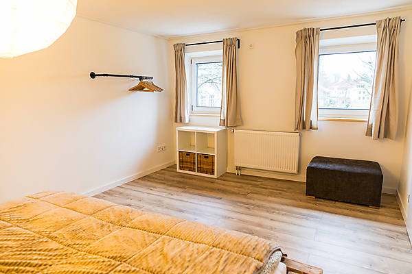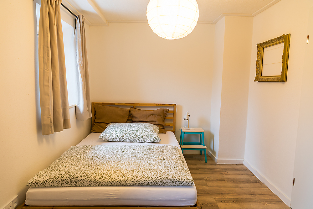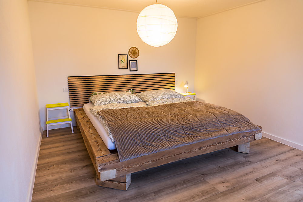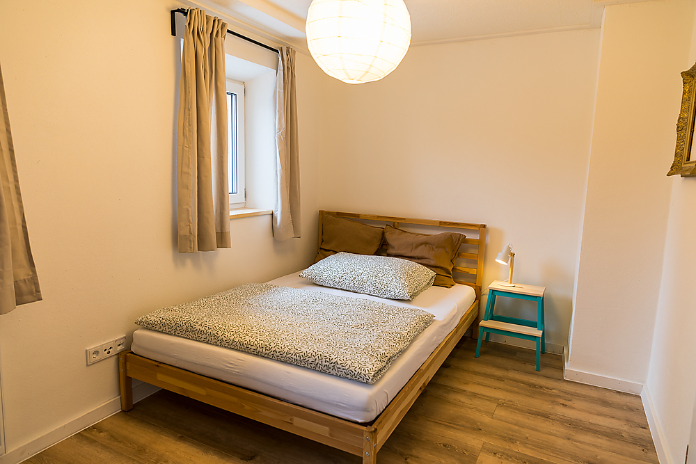 Erste Etage: Kinderzimmer mit einem Bett (2 Meter auf 1,40 Meter) und Schlafzimmer mit Doppelbett (2 Meter auf 2 Meter), kleiner Flur, kleiner Balkon